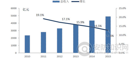 國內(nèi)市場對安防的需求依然高漲。國內(nèi)安防市場在過去5年實(shí)現(xiàn)了翻倍增長,已達(dá)5000億規(guī)模。受下游需求和經(jīng)濟(jì)放緩影響,安防增速開始逐漸放緩。預(yù)計(jì)在今后幾年增速繼續(xù)回落,但是仍能維持10%以上的較高速度增長。